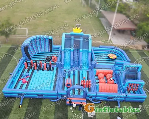 74ft long blue bounce big funland included jumping, climbing wall, slide.